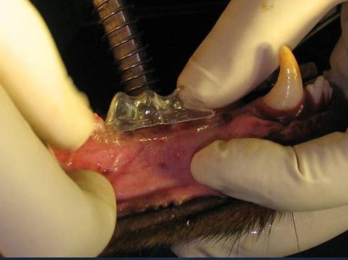 This study was approved by the Ethics Committee of Shiraz University of Medical Sciences. Two mixed-breed, male dogs were randomly selected and primarily examined by a veterinarian to ensure there was no interfering factor such as diabetes, osteoporosis, etc. The dogs were kept in a fasting state for 12 hours before anesthesia to prevent nausea and vomiting during the course of the surgery. General anesthesia was provided by a veterinarian by administration of 2% acepormazine (0.5 mg/kg) and then nesdonal (17 mg/kg). Condensing silicon (Speedex Coltene, Coltène/Whaledent AG, Altstätten, Switzerland) impressions of the entire dentition were then made for both dogs to be a model for future reference in making temporary prostheses and clear stents.