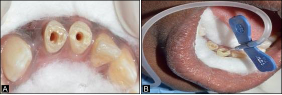 Figure 5.a. Access opening of tooth #11; b. Homing of stem cells into tooth #11.