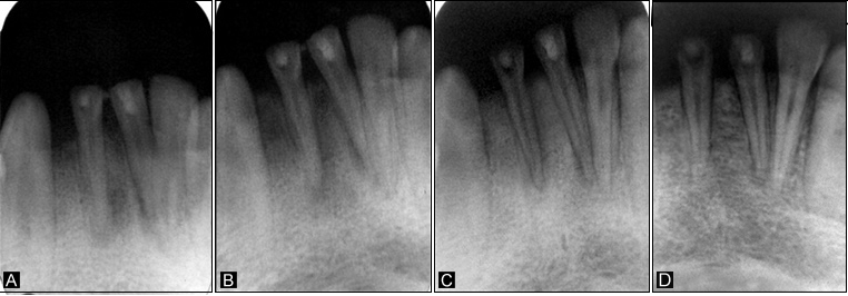 A twelve-year-old male patient reported to the Department of Pedodontics and Preventive Dentistry, complaining of fractured lower anterior teeth. The patient gave a history of trauma six months back and on clinical examination, an Ellis class IV fracture was seen in teeth #31 and #41. Radiographic examination revealed periapical radiolucency involving both #31 and #41 (Figure 4a). The teeth tested negative to both electric and heat tests. After obtaining parental consent, it was decided to complete the access (Figure 3a) and biomechanical preparation in the first visit, followed by 3Mix (1:1:1 ratio) placement and closure of the access cavity with zinc oxide-eugenol cement. During subsequent appointment after two days, the canals were thoroughly irrigated with normal saline, followed by drying with paper points and placement of tissue scaffold PerioGlas® (bioglass) and homing of SHED from apex to 5 mm of the access cavity with a 25-gauge needle in the root canals of teeth #31 and #41 (Figure 3b). A 5-mm thickness of glass-inomer cement was used to seal the access cavity. The patient was scheduled for recall examination and advised to call if he felt pain. On recall examination after one week, the patient was asymptomatic and reported no pain (Figure 4b). In the 30-day review, the patient was asymptomatic and had no signs of pain or tenderness upon vertical percussion. The radiograph showed significant resolution of radiolucency in relation to teeth #31 and #41 from 30-day recall to the 365-day follow-up (Figure 4c and 4d) and responded positively to electric pulp testing from the 90-day to 365-day recall evaluation. The improvement in the radiolucency may be due to the healing capability of SHED placed in the sterile cavities of teeth #31 and #41. Upon reaching the apical area, SHED might have proliferated and transformed to osteoblast-like cells, leading to bone formation.