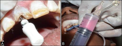 A 12-year-old male patient reported to the Department of Pedodontics and Preventive Dentistry with a chief complaint of fractured upper front tooth. The patient had a history of trauma to tooth #11 two years back. Upon clinical examination, the patient was asymptomatic, and the tooth #11 with Ellis class IV fracture exhibited no response to thermal and electric pulp testing. Radiographically open apex in association with periapical lesion of approximately 2 mm in diameter was seen in #11 (Figure 6a). To promote faster healing, we planned to attempt and achieve regeneration of periapical tissues and pulp by tissue engineering technique with his parental consent. Access opening was prepared and the necrotic pulp tissue was removed (Figure 5a). The root canal was thoroughly irrigated with normal saline solution and dried using absorbent paper points. Then, the scaffold PerioGlas® (bioglass) was introduced into the canal, followed by homing of SHED (Figure 5b) and the cavity was sealed with a glass-ionomer cement of 5 mm thickness. The patient was scheduled for review examination and advised to call if he felt pain. The patient returned after 7 days; he was asymptomatic, reporting no pain to percussion tests (Figure 6b). In the 30-day review, the patient was asymptomatic, and showed no signs of pain. The radiograph showed complete resolution of periapical radiolucency and the closure of apex with thickening of dentinal walls in relation to tooth #11 which continued until the 365-day follow-up period (Figures 6c and 6d). Electric pulp testing was found to be positive for the treated tooth #11 from the 3-month recall to 12-month follow-up.