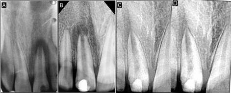 Figure 6.A: Preoperative radiograph displaying periapical radiolucency in relation to tooth #11; B: 7-day postoperative radiograph; C: 30-days follow-up radiograph showing complete radiolucency in relation to tooth #11. D: 365-day follow-up radiograph.