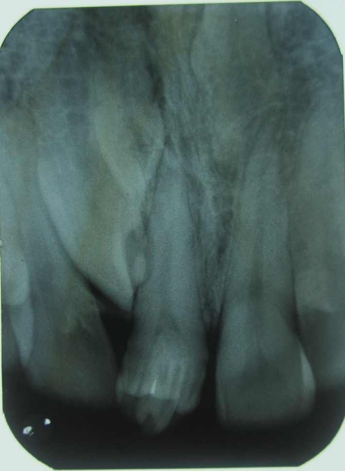 A 32-year-old male patient reported to the Department of Oral Medicine and Radiology for routine check-up. This was the patient’s first visit to a dentist. His medical and family histories were non-contributory. There were no findings indicative of any syndrome. An intraoral examination of maxillary right central incisor revealed a morphologically altered crown with multiple small cusps and a prominent central cusp (Figures 1 and 2). There were 5 small cusps and a prominent central cusp. Presence of talon cusp in relation to teeth #12, #13 and #33 was also seen. Mild stains were present on the occlusal surface of central incisor with pit caries. Intraoral periapical radiograph revealed prominent talon cusp at the center surrounded by small cusps along with three impacted supernumerary teeth at the periapex. The root, lamina dura and periodontal ligament space of tooth #11 appeared to be normal (Figure 3). Examination of the remaining dentition showed no obvious abnormalities. The patient was told about the condition. Routine scaling and oral prophylaxis were performed. Prosthetic crown in relation to tooth #11 was planned to correct the esthetic appearance and surgical removal of impacted teeth was suggested. Since the patient was asymptomatic, he refused to undergo extraction of the impacted teeth. However, he was advised to undergo prophylactic enameloplasty of the talon cusps, followed by topical application of a desensitizing agent. He was also informed about the possible consequences of the impacted teeth and a regular clinical and radiographic follow-up of the impacted tooth was suggested.