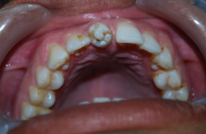 Figure 3. Intraoral photograph showing an unusual and morphologically altered central incisor with 5 small cusps and large central cusp.