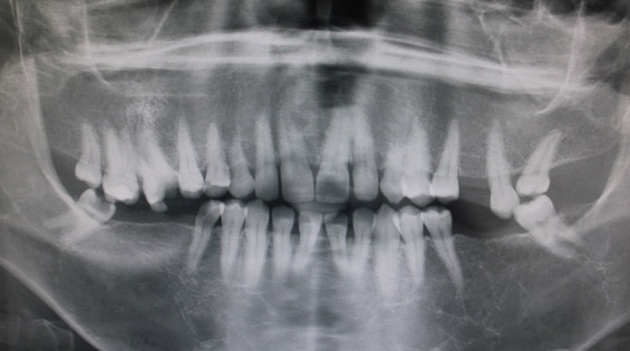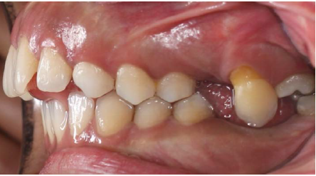 In this condition, the prosthodontic treatment modality necessitates administration of extensive orthodontic and surgical interventions to create adequate space for the replacement of the missing tooth. However, due to economic issues, the patient did not accept any prosthodontic treatment and only received endodontic therapy for the maxillary first molar.