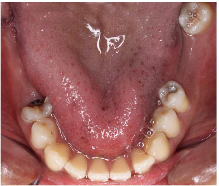 The patient underwent radiological examination. The panoramic views revealed the enlargement of marrow spaces with widened trabeculae in both the maxilla and mandible (Figure 2). The soft tissue drapes had normal color and contours. The only abnormal finding in soft tissue examination was macroglossia (Figure 4).