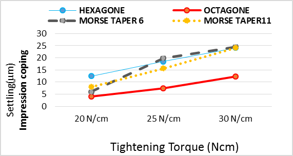 Vertical displacement of impression coping in different connections used in our study was higher in Hex and morse hex 6° in 25 Ncm torque compared to morse taper 11° and octagon. However, in 30 Ncm torque, the final value of settling was identical in all the 3 types of connections of hex, morse hex 6° and 11°, and was higher compared with the octagon.