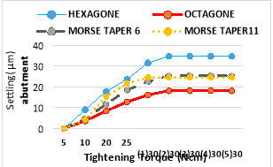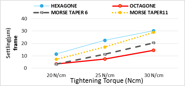 In 25 Ncm torque: Hexagon and morse taper 11° implants had significantly the highest settling while octagon implant had significantly the lowest settling.