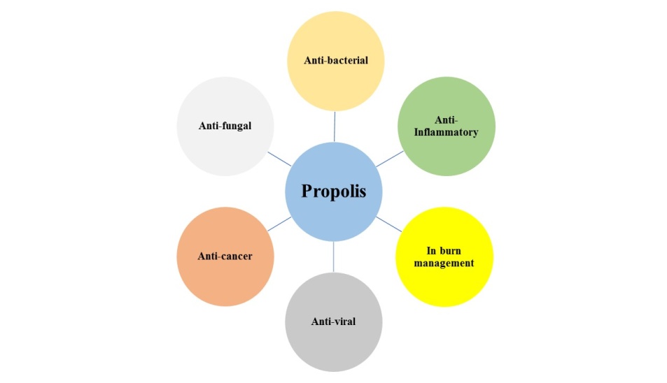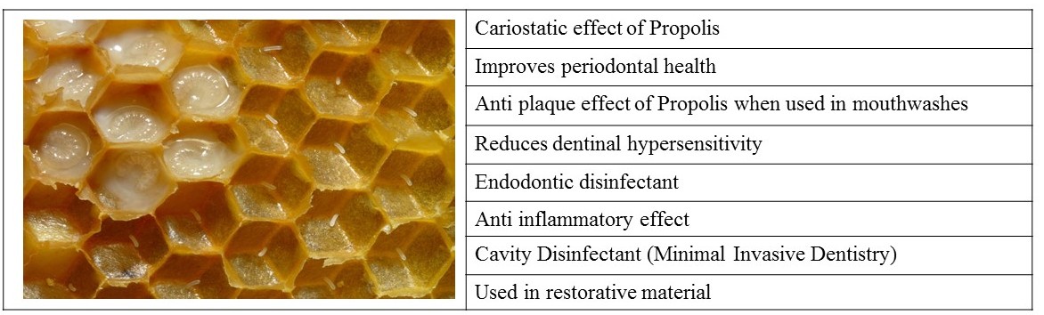 Propolis, having a wide variety of therapeutic advantages, i.e. being cost-effective and biocompatible with the human cell, with no toxicity, limited allergic reaction and ready availability, can be used widely in medicinal care (Figure 3).19,20