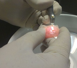 Er,Cr:YSGG laser (BIOLASE Inc.,USA) was irradiated at 2780-nm wavelength, pulse duration of 60μS and 20-Hz frequency. Laser was irradiated at 0.25-W(G2), 0.5-W(G3), (G4) and 1-W (G5) powers under water (60%) and air (80%) spray for cooling via an MZ6 glass tip (diameter of 600 μm) with swiping motion at 1-mm distance from the specimen surface in two cycles to ensure uniform irradiation of the entire surface (Figure 1). The total time of laser irradiation for each sample was approximately 30s. The samples were then stored in distilled water in capped test tubes at 37°C.