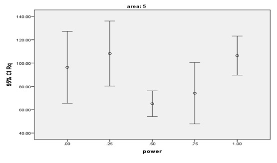 The lowest mean Rq and Ra values were found in the laser group with 0.5-W power (G3) while the highest mean Ra and Rq values were found in the laser group with 0.25-W power(G2). The highest numerical Ra and Rq values were noted in the control group (maximum value) and the lowest numerical Rq and Ra values were noted in the laser group with 0.75-W power (G4, minimum value). Table 1 shows the mean and SD values of surface roughness in the five groups. Based on the results, surface roughness (Rq and Ra) in G3 (laser therapy with 0.5-W power) was slightly (but not significantly) lower than that in G2 (0.25-W power) and significantly lower than that in G5 (1W, P=0.003). No such significant differences were noted in other groups. The mean and 95% confidence interval of the Rq surface roughness parameter after laser irradiation are shown in Figures 4 and 5. Laser therapy with 0.5 and 0.75-W power (G3 and G4) decreased surface roughness and the lowest surface roughness value was noted after laser irradiation with 0.5-W power (G3).