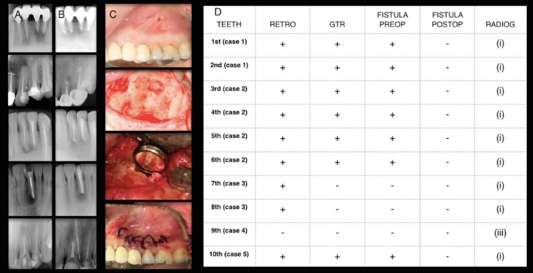 A. Preoperative radiographs; B. Postoperative radiographs (6th month); C. Clinical photos of a case; D. Operative procedures, presence of fistula, radiographic healing