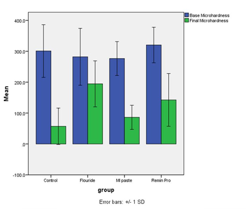 The majority of previous studies on Remin Pro focused on its effects on bleached teeth. For instance, Heshmat et al29 evaluated and compared the effect of Remin Pro, MI Paste Plus and natural saliva on microhardness of bleached teeth. They measured the microhardness at baseline and after bleaching with 35% hydrogen peroxide. Next, they used Remin Pro, MI Paste Plus and natural saliva for 15 days and measured the microhardness of samples again after the intervention. They concluded that the surface microhardness of samples decreased after bleaching but no significant difference was noted among the three materials for increasing the surface microhardness of samples.