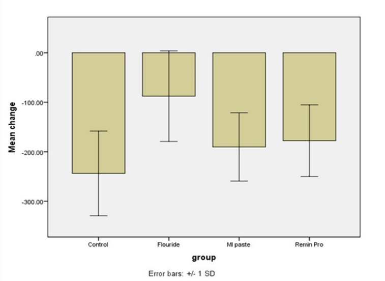 Assessment of microhardness values after the intervention revealed that the surface microhardness of all the samples in the four groups changed after the intervention compared to the baseline values. The minimum change in microhardness occurred in group 2 samples subjected to NaF mouthwash, which means that NaF had the greatest efficacy for prevention of enamel demineralization, followed by Remin Pro (group 4), MI Paste Plus (group 3) and the control group (group 1). Descriptive statistics of surface microhardness values in the study groups are shown in Table 1. The mean changes in microhardness of samples are presented in Figure 1.