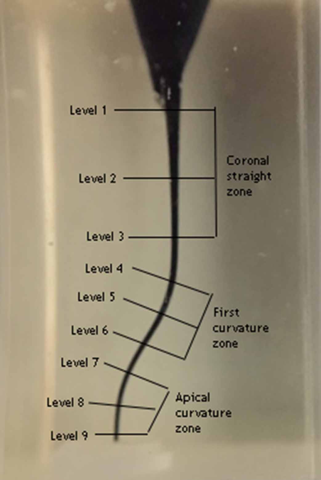 Then the root canals were dyed with red ink (Pelikan, Istanbul, Turkey) using a syringe. The post-preparation images were taken and saved as JPEG files. Pre- and post-preparation images were transferred to an image analysis software (AutoCAD, Autodesk, San Rafael, CA, USA) for superimposition. Nine measurement points were detected along the length of the canals and evaluated by dividing into 3 zones, as levels 1‒3 at coronal straight zone (CS), levels 4‒6 at first curvature zone (FC) and levels 7‒9 at apical curvature zone (AC) (Figure 1). The amount of the resin removed from the inner and outer sides of the canals was measured by AutoCAD. The amount of transportation was calculated as the absolute value of the difference between the amount of resins removed from inner and outer aspect of canals. Centering ratio was calculated using the amount of resin removed from 2 aspects of canal by dividing the smaller to the greater one. Data were analyzed using independent t-test or Kruskal-Wallis tests according to the normality of data distribution with 5% significance threshold using SPSS (IBM, SPSS Inc, Chicago, IL, USA).