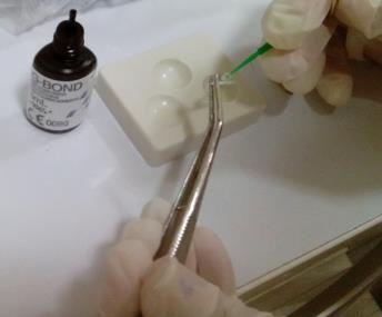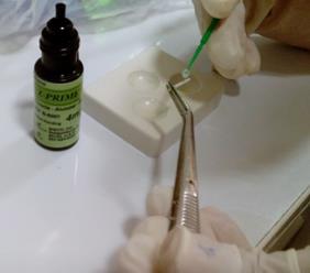 In the other group, all the steps stated above were repeated except that Z-PRIME Plus was replaced by G-Bond to prepare the surface of the zirconia post (Figure 5). The control tooth did not receive any surface treatment.