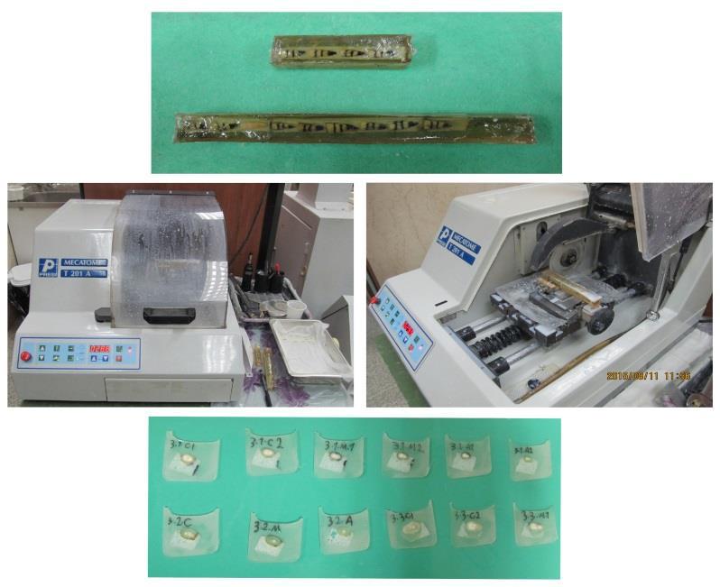 Twenty-four hours after cementation and mounting of the samples in polyester, the post was cut into three equal apical, middle and coronal pieces from the apical area using a cutting machine (Figure 6).28