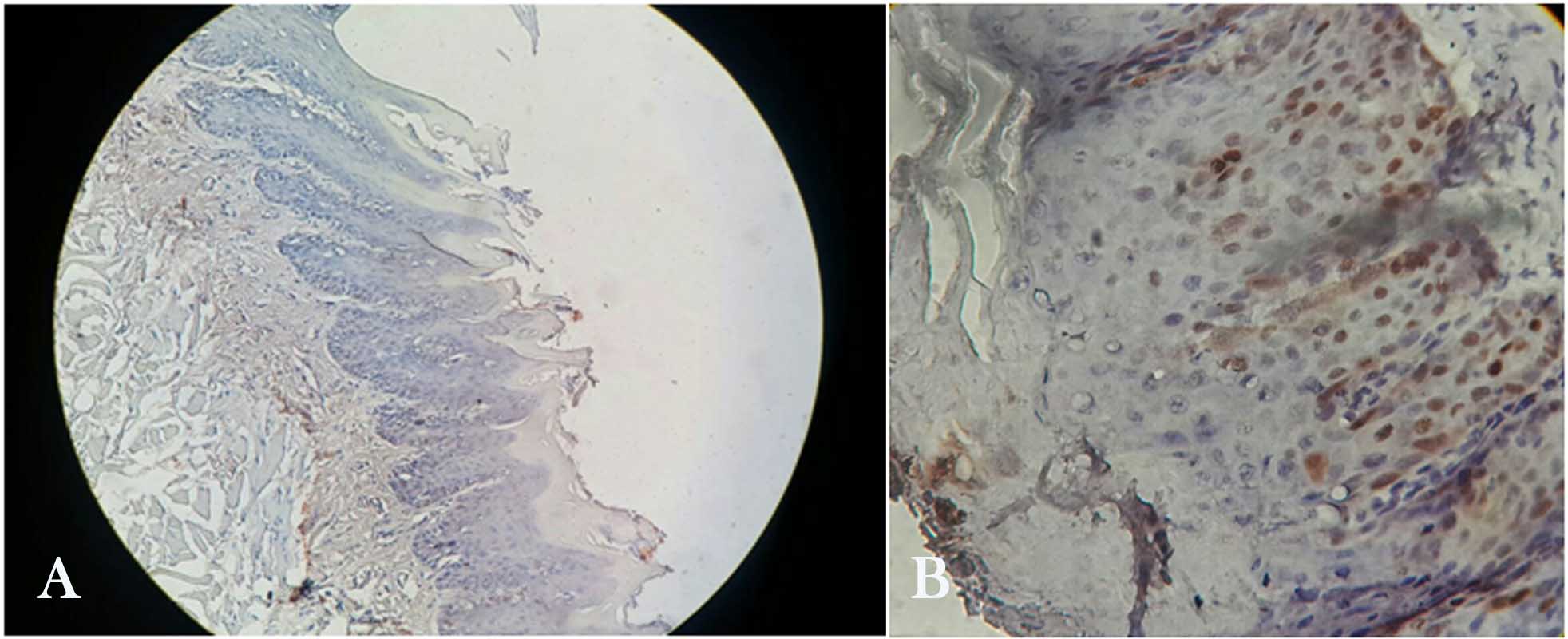 Figure 1. Cyclin D1 immunohistochemical staining in tongue dysplasia (A and B) (A: grade 0: non-staining of cells. B: grade 1: staining 5‒50% of cells) (×400).