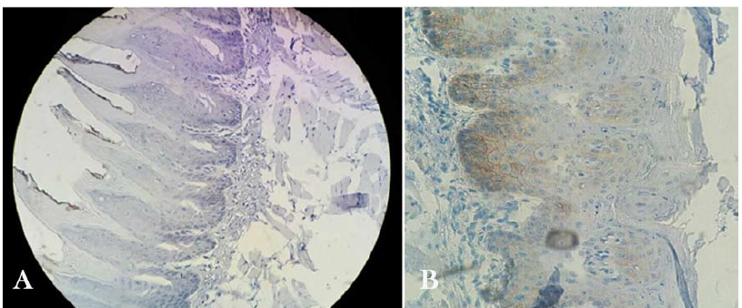 Figure 3. EGFR immunohistochemical staining in tongue dysplasia (A and B) (A: grade 0: staining less than 10% of cells. B: grade 1: staining 25‒10% of cells) (×400).
