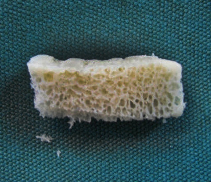 During implant placement, using a 3-mm trephine bur, a biopsy sample was taken from the interface of bone and allograft for histological assessment (Figure 9). All the samples were kept in 10% formalin solution and sent to a pathologist. In the laboratory, the samples were placed in decalcifying solution and then embedded in paraffin blocks. Following preparation of 4‒5-µm cross-sections, the blocks were stained with hematoxylin and eosin. Finally, the samples were histologically assessed to see whether a distinction could be made between the native bone and the newly-formed bone. Given that such a distinction is present, the samples would also be histologically investigated in terms of the amount of newly-formed bone, bone marrow spaces, the amount of corticocancellous block remaining and the degree of inflammation by a pathologist.