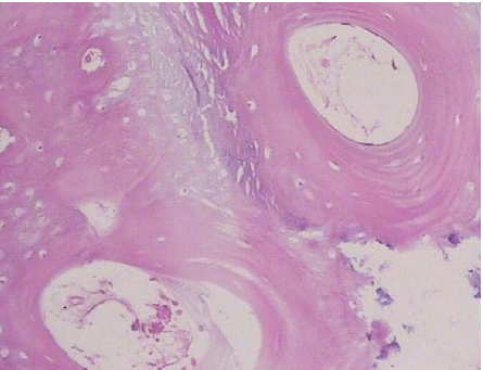 Our histological analysis failed to reveal any clear distinction between the newly-formed bone and the native bone and no sign of allograft was detected in any of the prepared specimens. On the basis of this observation, no further histological investigation was performed regarding the amount of newly-formed bone, bone marrow spaces, the amount of corticocancellous block remaining and the degree of inflammation. Vital lamellar and trabecular bone tissue containing osteocytes and lacunar spaces were detected in the biopsy specimens (Figure 10).