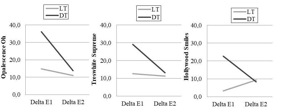 When each bleaching system was analyzed in regard to DE values between lighter and darker teeth following bleaching (∆E1-LT vs. ∆E1-DT) and staining (∆E2-LT vs. ∆E2-DT), all the products exhibited ∆E1-DT values significantly higher than ∆E1-LT values (P=0.000). Following staining, no significant difference was reported between ∆E2-LT and ∆E2-DT for Treswhite Supreme (P=0.175) and Hollywood Smiles (P=0.220). However, ∆E2-DT values were higher than ∆E1-LT values for Opalescence Oh (P=0.041).