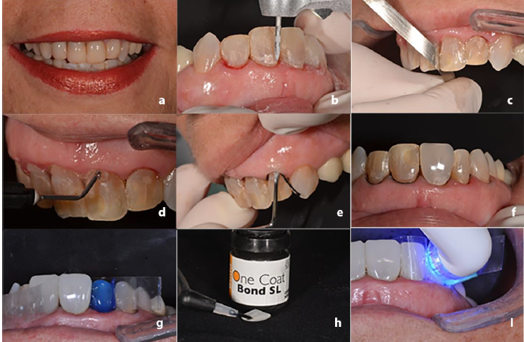 Case 2. Initial aspect (a). Preparation of tooth (b). Interproximal wear with abrasive stainless-steel strips (c). Application of hemostatic gel (d). Insertion of retraction cord (e). Dry proof of PCRV (f). Acid etching (g). Appli-cation of adhesive on the PCRV (h). light-curing with LED (i).