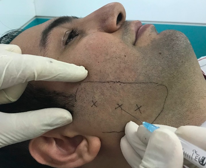 Injecting into the bulk of the masseter muscle to deposit the toxin at a depth of 1 cm at 3 points.