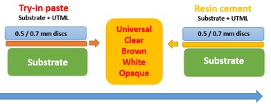 . Perceptible color difference was found between the try-in pastes and the respective resin cement in most colors investigated. Although, the agreement of the try-in pastes and the respective resin cement was affected by the thickness of zirconia veneers, the different regions of multilayered ultra-translucent zirconia ceramic showed no significant effect.
