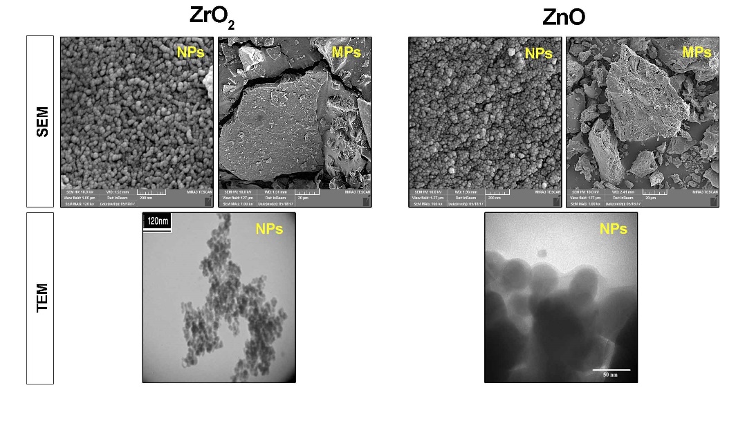 Representative images of ZrO2 and ZnO particles analyzed by SEM and TEM techniques.