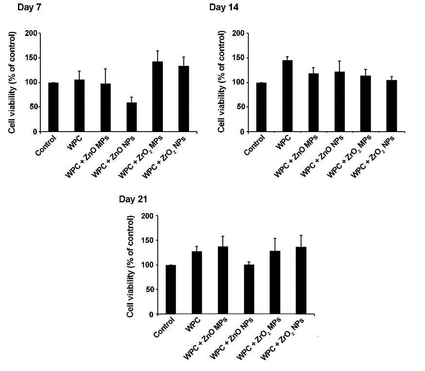 Detection of HDPSCs survival rates, plated on WPC enriched by ZrO2 and ZnO particles over a period of 21 days. In all the groups, except for WPC + ZnO NPs, an increased cell survival rate was evident. On day 21, the cell viability index in cells from the WPC + ZnO NP group was similar to the control group. These data showed that WPC substrate enriched by ZrO2 and ZnO particles was suitable for the expansion and culture of HDPSCs