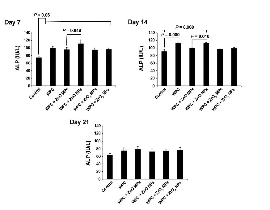 In light of ALP activity, the ELISA assay showed significant differences in ALP activity in groups over a period of 21 days (P<0.05). On day 7, there was a statistically significant ALP activity increase in all the groups in comparison with the control group. Compared to cells grown on WPC+ZnO MP surfaces, HDPSCs juxtaposition to WPC+ZnO NPs resulted in a superior ALP activity (Pday 7 =0.046, Pday 14 =0.01). No significant difference was observed in ALP activity between WPC+ZrO2 MP and WPC+ZrO2 NP groups (P>0.05). On day 14, significant differences in ALP activity were detected in WPC and WPC+ZnO NPs (P<0.05). The level of ALP activity decreased on day 21 in comparison with matched-groups of day 7. Although the level of ALP activity was more than the control group in all the groups 21 days after cell culture, it was not statistically significant (P>0.05; Figure 3).