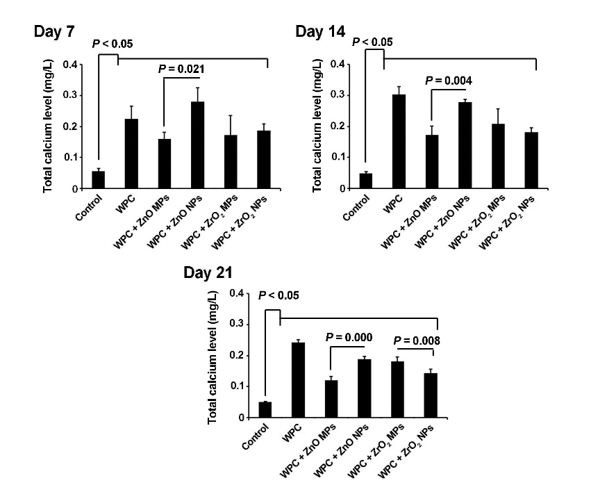 All the materials used in the current experiment exhibited an increased ionized calcium level in the supernatant in comparison with the control group at the 3 time intervals (P<0.05). On day 14, a superior effect of WPC+ZnO NPs and WPC alone was observed on the ionized calcium content (P<0.05). Based on our data, the calcium level decreased but remained significant compared with cells from 7- and 14-day time intervals (Figure 4).