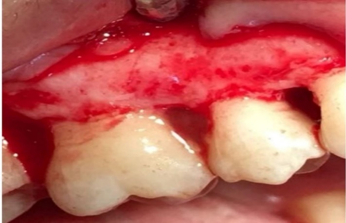 All the enrolled patients signed a written informed consent form. Oral hygiene instruction, scaling and root planing (SRP) were provided to all the patients to achieve a satisfactory level of biofilm before surgery. Occlusion was corrected if needed. All the surgical procedures were performed by the same person: intrasulcular incision with mucoperiosteal flap elevation, debridement of granulation tissue, subgingival SRP, and rinsing with normal saline solution. Then, the patients were assigned to the groups based on the predefined random allocation.