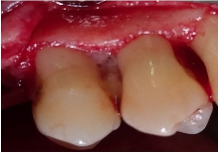 Then, the flap was sutured in place with silk 3-0 sutures, and the patients were discharged with antibiotic prescription (amoxicillin, 500 mg, TID), the directions for oral hygiene (0.12% chlorhexidine, 5 mL, BID) and with the recalls schedule.