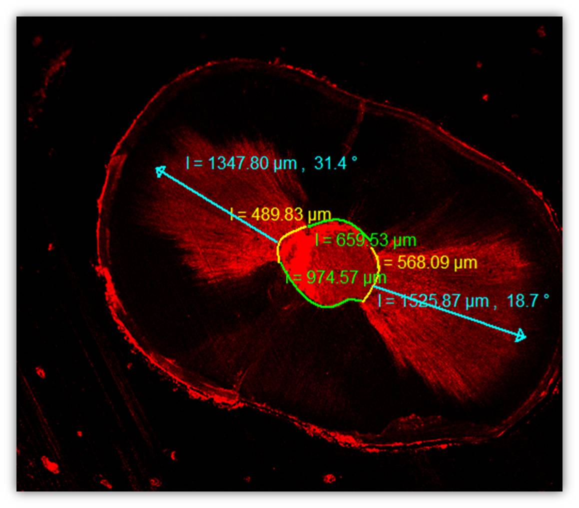 The slices were photographed under a CLSM (Zeiss LSM 510; Carl Zeiss, Jena, Germany) and a method of epifluorescence with wavelengths of absorption and emission for rhodamine B at 540/590 nm. The images were analyzed in the CLSM Image Browser (Carl Zeiss) to measure the longest penetration depth of the sealer and the percentage of the penetrated sealers into the dentinal tubules as shown in Figure 1. The sealer penetration depths in the dentinal tubules were measured at their maximum depth for each specimen. The depth of penetration was measured from the canal wall to the point of maximum sealer penetration.13