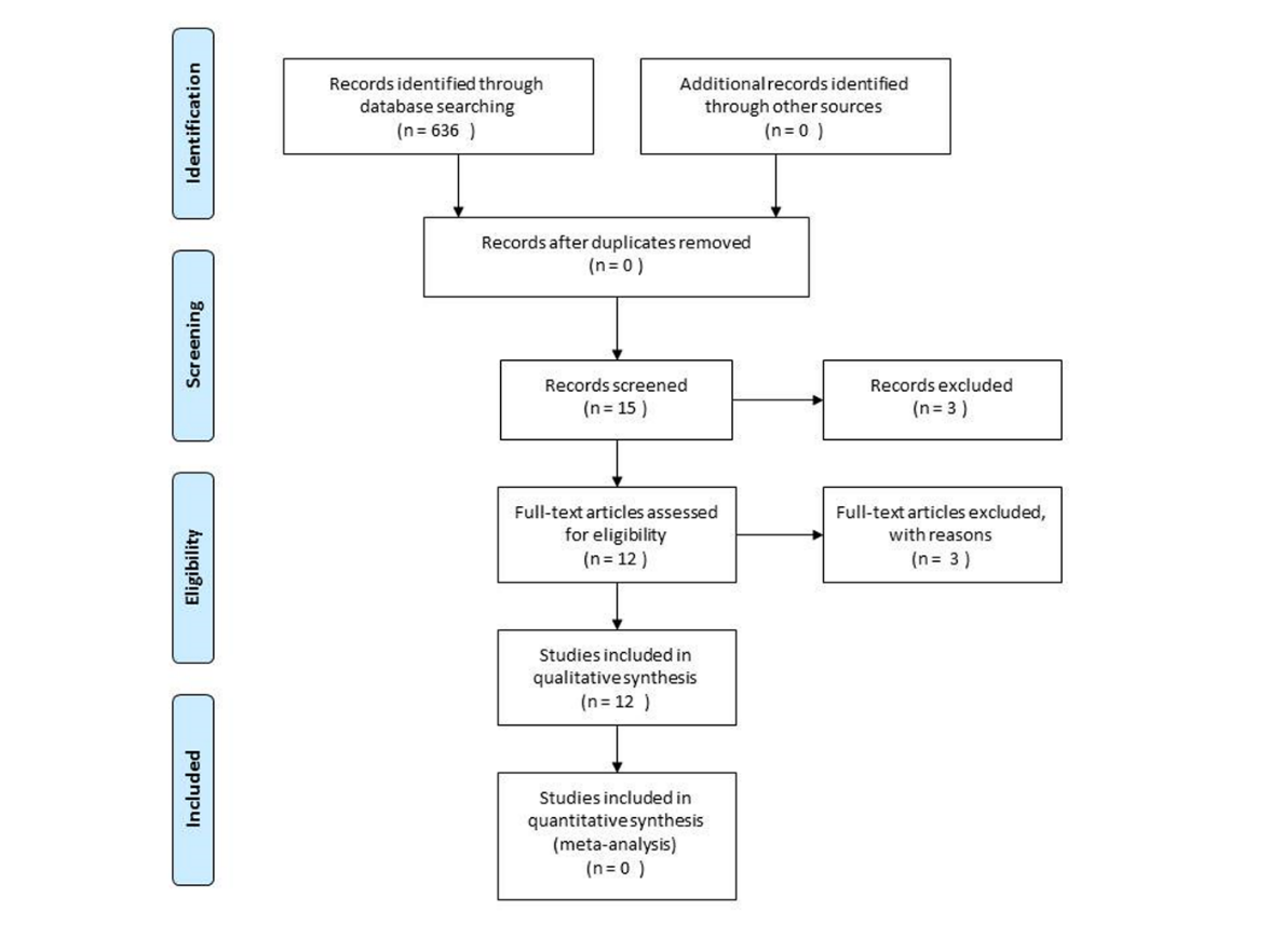 A total of 632 studies were found with the search terms. By reviewing the titles and abstracts of each study, 15 were selected, of which one was excluded because it was not available for download at our institution and 2 were excluded after reading their full texts, for not fitting the inclusion criteria. Thus, 12 studies were selected to carry out this systematic review (Figure 1).