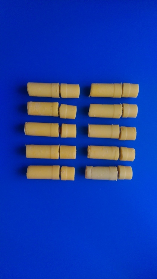 The implant‒abutment (I/A) assemblies were placed in fast-setting putty (Panasil Putty, Kettenbach GmbH & Co. KG. Germany) to the interface of the I/A in order to minimize the incidence of bonding of radiotracer to their external surfaces (Figure 4). Cyanoacrylate adhesive was used in the interface for prevention of penetration of radiotracer between the putty and fixture. The positive control sample was not covered by putty, while the negative control sample was completely covered by putty.