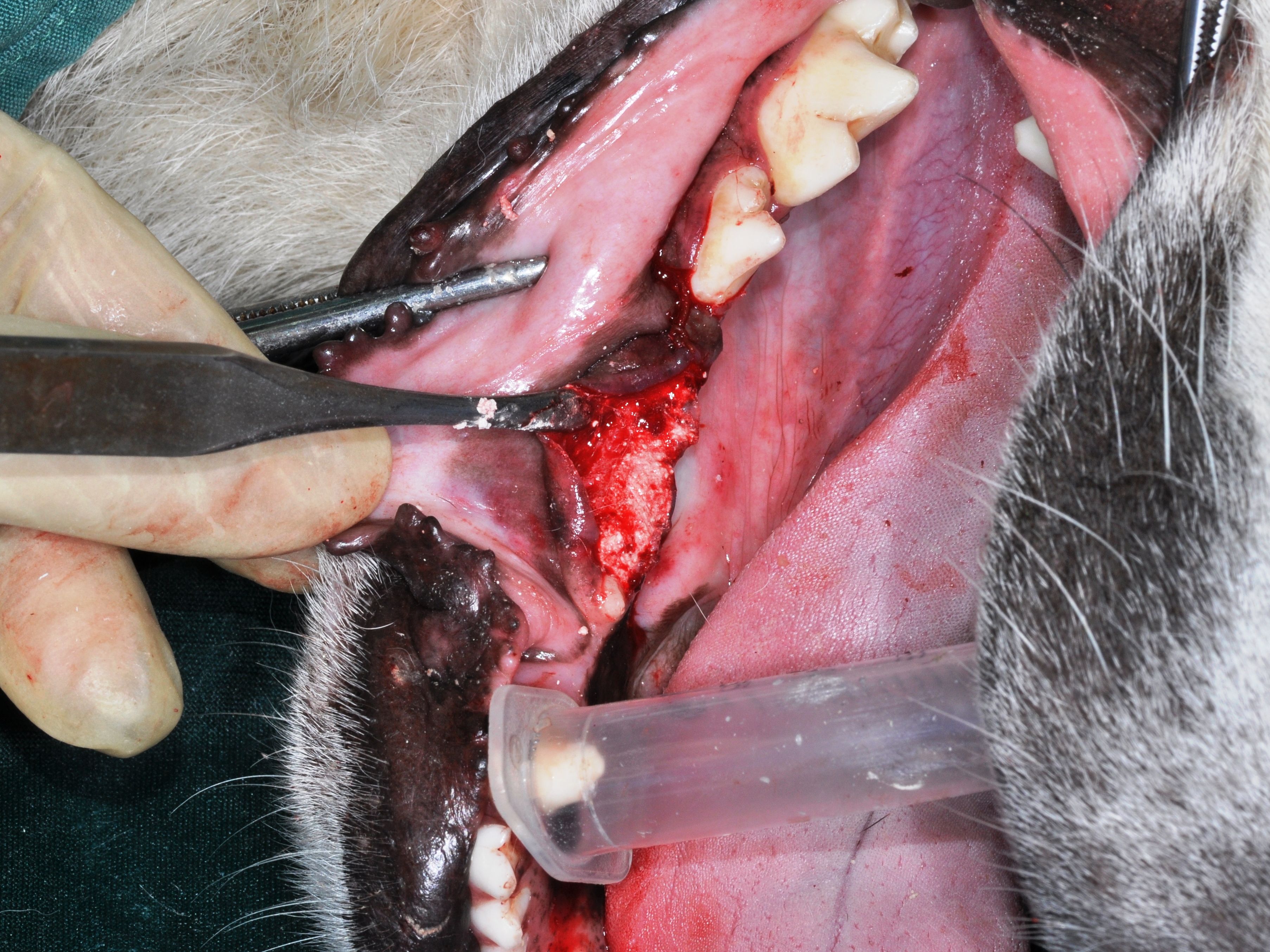 General anesthesia was induced after 12 hours of fasting state. Conventional infiltration anesthesia (2% lidocaine, Epinephrine: 0.00001, produced by Darou Pakhsh Co., Iran) was also administered in the mental foramen. After that, the oral cavity of the animal was washed with 0.12% chlorhexidine mouthwash, and then on both sides of the lower jaw, the second and third premolar teeth were extracted. To prevent the remaining bony walls being damaged, the roots were separated by drilling and extracted independently by forceps. For better visibility of the bony walls and also the possibility of the tension-free covering of cavities after insertion of materials, the buccal and lingual flaps were elevated beyond the mucogingival junction.