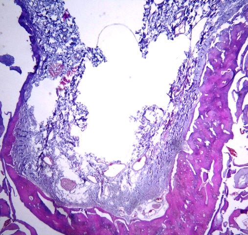 Histological examination of the slides obtained from all the samples was performed by a pathologist using a Leica binocular microscope equipped with a Sony digital color camera. The samples were examined by a blinded pathologist. Histomorphometric measurements of the slides were carried out using ImageJ software developed at the National Institutes of Health. The measurements consisted of the ratio of the area of newly formed bone to the area of the entire cavity, and the ratio of the area of fibrous connective tissue to the area of the entire cavity. The slides were also examined for the presence or absence of inflammation.