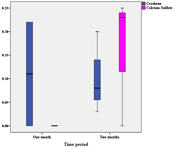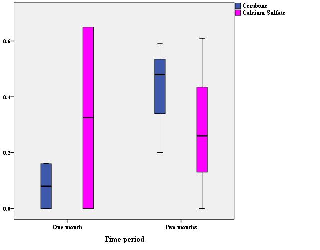 Comparison of the ratio of the area of newly formed bone to the area of the entire cavity showed that although the mean of the Cerabone group was slightly higher than that of the calcium sulfate group, no statistically significant difference was observed (Table 1). The separate comparison of the ratio of the area of newly formed bone to the area of the entire cavity in one-month (P=0.32) and two-month (P≈1.00) periods did not show any statistically significant differences between the two groups of Cerabone and calcium sulfate (Figure 4). In the two-month period, unlike in other cases, the average ratio of the area of newly formed bone to the area of the entire cavity in the calcium sulfate group was slightly higher.