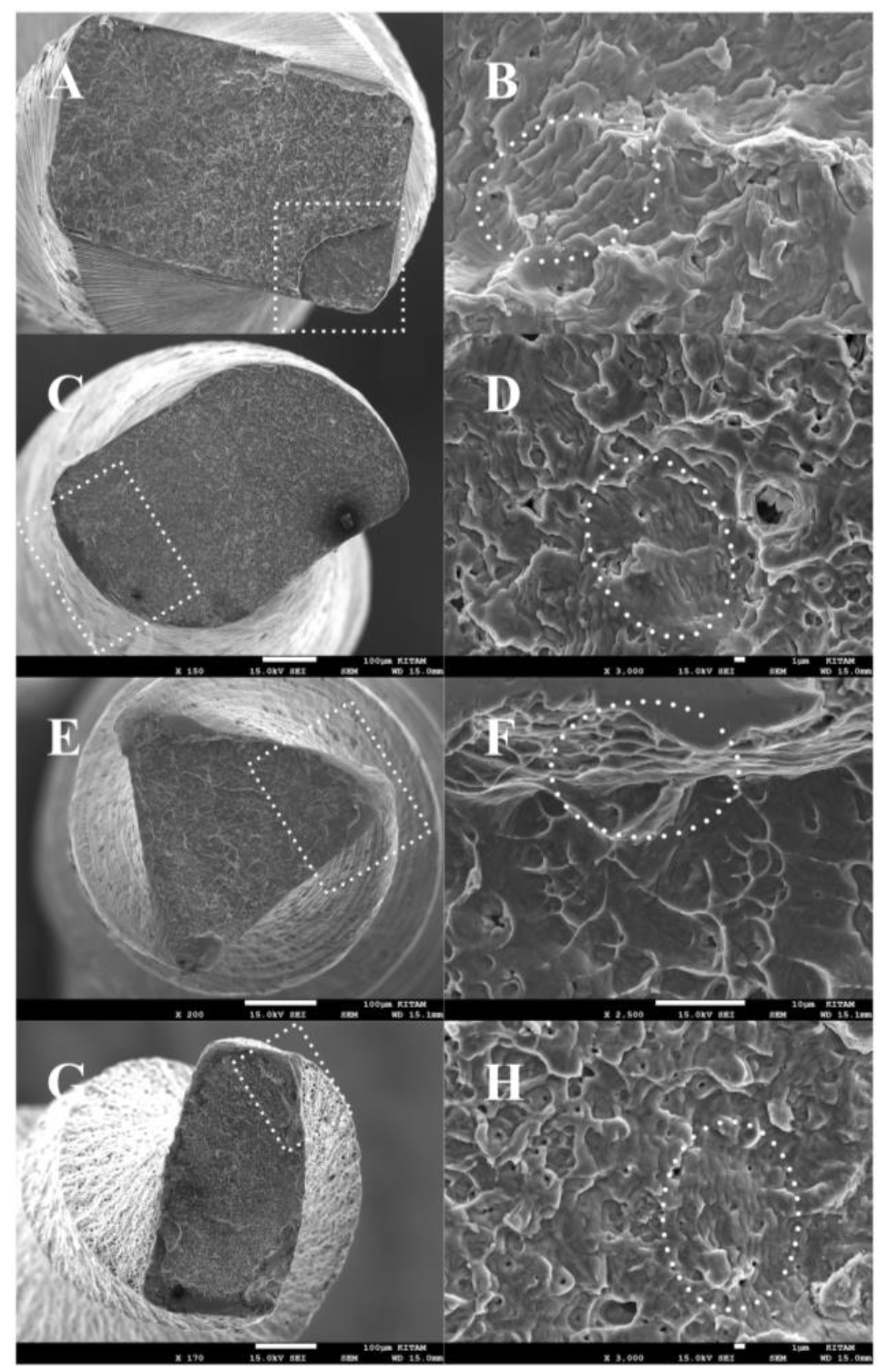 Figure 1. Scanning electron microscopic views of the HEDM, WOG, RPC Blue, and TFA files after cyclic fatigue testing. The fractured surface views of (A) WOG, (C) RPC Blue, (E) TFA, and (G) HEDM Blue and a high-magnification view of (B) WOG, (D) RPC Blue, (F) TFA, and (H) HEDM Blue instruments. The crack initiation origin and overload zone (A, C, E, G) and typical fatigue striations of cyclic fatigue (B, D, F, G) (white dottled line).