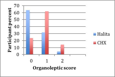Post-treatment organoleptic scores in the Halita and 0.2% chlorhexidine groups.