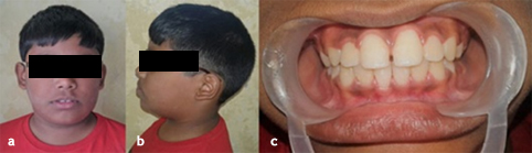 Figure 1.Preoperative: a) Extraoral frontal view; b) Extraoral lateral view; c) Intraoral view.