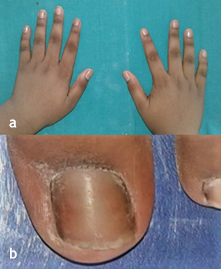 Figure 2. Preoperative view of a) fingernails; b) mutilated toe nail.