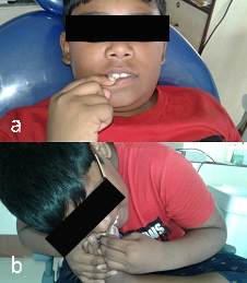Nail biting or onychophagia is defined as the crossing of any digit from an individual’s lips.1 It is a “body-focused repetitive behavioral act,” i.e. it is habitual and difficult to suppress.2 It usually does not manifest before the age of 3 or 4 years.2 Prevalence varies from 20 to 33% in childhood.2 The frequency of this habit decreases by 18 years of age but may continue into adulthood.2 Males and females up to 10 years of age may equally perform the habit; thereafter it is seen more frequently in males.3 Onychophagia falls under impulse control disorder in the DSM-IV-R and is classified as an obsessive‒compulsive and related disorder in the DSM-5.3 Subjects with onychophagia can chew off nail beds, resulting in chronic scarring accompanied by red inflamed fingers.3 Nail biting is associated with some complications, including infection of the nail beds, notably onychomycosis and onycholysis.6 Deleterious dental effects are alveolar bone destruction, apical root resorption, chipping off incisal edges of anterior teeth, minor crowding, rotation, proclination of maxillary anterior teeth and temporomandibular joint dysfunction.6 Occasionally such habit might be so severe as to cause entrapment of bitten-off finger nails in the gingiva.5