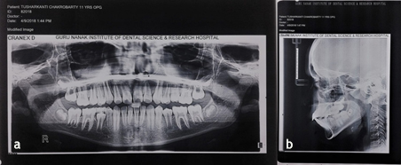 Figure 4.Preoperative: a) Panoramic view; b) Lateral cephalogram