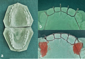 Maxillary and mandibular impressions were made in alginate to prepare working casts (Figure 5a). The appliance was fabricated with a modification of the design advocated by Marouane et al.6 It consisted of 26-gauge stainless steel round wires twisted around each other. These were adapted along the lingual surfaces of the mandibular anteriors in the cast. Vertical extensions arose from the wires lying interdentally (Figure 5b). Modification in this appliance framework was introduced by us, by adding a third horizontal assembly of twisted stainless-steel round wires resting on the incisal edges (Figure 5c).