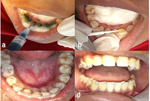 Oral prophylaxis followed by proper isolation was done intraorally. Following etching (Figure 6a) and application of a bonding agent (Figure 6b), the appliance was fixed in its desired position with light-cured composite resin (Figure 6c and 6d).