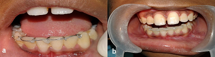 The patient was recalled after 1 month. It was observed during that time that the horizontal component lying on the incisal edges had shifted labially (Figure 7a). The shifted horizontal component was fixed in its new position with light-cured composite resin (Figure 7b).