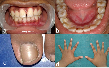 Figure 8. a) Intraoral frontal view after 2 months; b) Intraoral lingual view after 2 months; c) Appearance of neat toe nail after 2 months; d) Appearance of fingernails of both hands after 2 months, showing clean and neat nails.